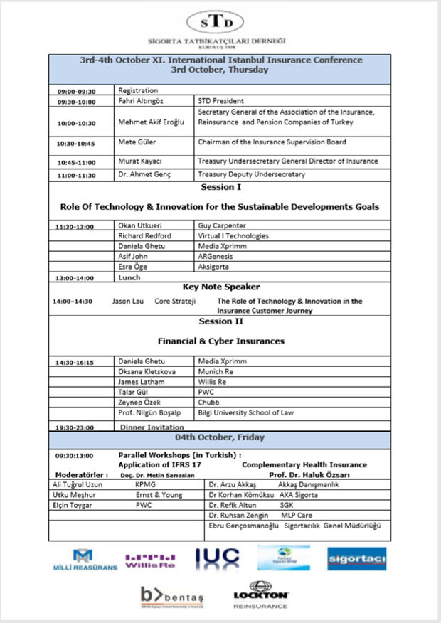 11’inci Uluslararası İstanbul Sigortacılık Konferansı’nın açılış konuşmalarını Sigorta Tatbikatçıları Derneği Başkanı Fahri Altıngöz, Hazine ve Maliye Bakanlığı Müsteşar Yardımcısı, Sigortacılık Genel Müdürü veZiraat Bankası Yönetim Kurulu Başkanı Dr. Ahmet Genç, Sigortacılık Genel Müdür Yardımcısı Murat Kayacı, Hazine ve Maliye Bakanlığı Sigorta Denetleme Kurulu Başkanı Mete Güler, Türkiye Sigorta Birliği Genel Sekreteri Mehmet Akif Eroğlu yapacak. Konferansın ilk gününde yapılacakoturumlardan öğleden önce gerçekleştirilecek “Sürdürülebilir Kalkınma Hedefleri İçin Teknolojinin ve İnovasyonun Rolü” ne , Richard Redford– Virtual I Techonologies , DanielaGhetu – Media Xprimm , Asif John – ARGenesis , Esra Öge – Aksigorta panelist olarak katılırken , Okan Utkueri – GuyCarpentermoderatör olacak , öğleden sonra yapılacak “Finansal ve Siber Sigortalar” oturumuna OksanaKletskova – Munich Re , James Latham – Willis Re , Talar Gül – PWC , Zeynep Özek – Chubb , Prf.Dr. Nilgün Boşalp – Bilgi Üniversitesi Hukuk Fakültesi sunumlarıylakatılırkenmoderatörlüğüDanielaGhetu – Media Xprimmyapacak. 2. Oturumdan önce JasonLau– Core Strateji, SigortalıarınYolculuğunda Teknoloji ve İnovasyonun Rolü konulu bir konuşma yapacak.
