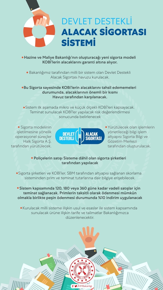 Albayrak, infografikle de sistemin işleyişine ilişkin bilgi aktardı. Buna göre, Bakanlığın oluşturacağı yeni sigorta modelinde KOBİ’lerin alacakları garanti altına alınacak. Bakanlıkça milli bir sistem olan Devlet Destekli Alacak Sigortası Havuzu kurulacak. Bu sigortayla KOBİ’lerin alacaklarını tahsil edememeleri durumunda, alacaklarının önemli bir kısmı havuz tarafından karşılanacak.