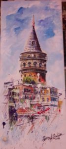 Bir kule; kalabalıktan sıkılmış ve yalnız, komşu evleri yok edilmiş, sokaklar, arabalar, insanlar yok. Dedim ya kendini dinliyor diye… Boynunu uzatmış gökyüzüne, granit, estetik, tarih ve zarafet mahallesinin bıçkın delikanlısını görüyorsunuz. Yalnız ve sitemkar bir isyan duygusuyla yüreğinde nefis bir ıslıkla dolaşıyor. İzliyorsunuz. Toprağa basmıyor ayakları, rüyalar aleminden geçiyorsunuz. Sonra birkaç renk; yukarıya doğru belirginleşen renkler, kırmızı geçiyor bedeninden, daha üstlerde birkaç ev görüntüsü, kırmızılar çok belirgin. Tarihin yaralarını açtığını görüyorsunuz yukarı baktıkça. Pencereler, balkonlar, ihtişamlı sarı, kırmızı, bordo renkler skalasıyla bakıyor sıcak sıcak. En üstte kulenin en tepe noktası huni gibi özgür ve kuşlarla arkadaş. Beyaz bulutlar arasında mavi gökyüzü gülümsüyor. Tatlı tebessüm kokulu ışığı, bolca maviyi izliyorsunuz.