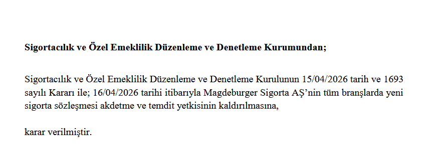 Sigortacılık ve Özel Emeklilik Düzenleme ve Denetleme Kurulunun 15/04/2026 tarih ve 1693 sayılı Kararı ile; 16/04/2026 tarihi itibarıyla Magdeburger Sigorta AŞ’nin tüm branşlarda yeni sigorta sözleşmesi akdetme ve temdit yetkisinin kaldırılmıştır
