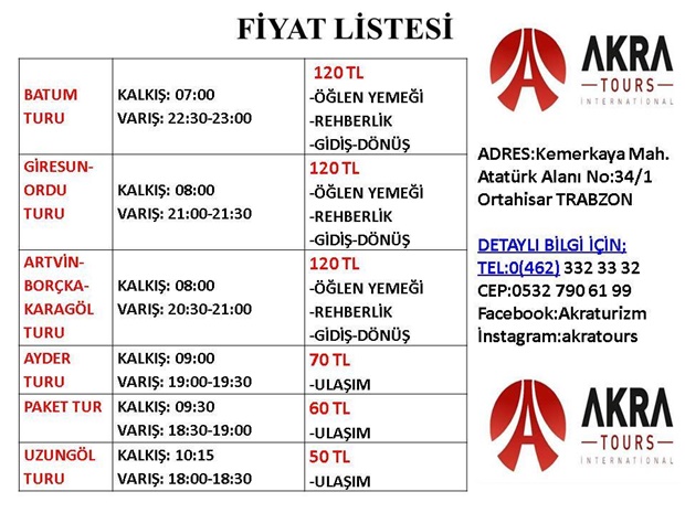 Merkezi Trabzon’da Trabzon meydanında bulunan Akra Tur Ordu, Giresun, Borçka, Artvin, Karagöl, Ayder, Uzungöl ve Batum turları başta olmak üzere birçok tur düzenlemektedir.