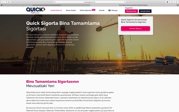 Konut sahibi olmak isteyenlerin anahtar tesliminden önce yaptığı ödemeleri teminat altına alan Bina Tamamlama Sigortası Quick Sigorta’da! Quick Sigorta Bina Tamamlama Sigortası konut alıcılarının ve yatırımcılarının en büyük güvencesi olacak!