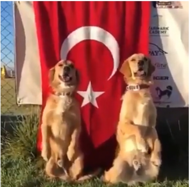 Kimliği belli olmayan ve Cumhuriyetin 95, yılının kutlandığı 29 Ekim günü sosyal medyaya düşen iki köpeğin İstiklal marşı ile Türk bayrağının önünde hazırolda durmaları paylaşım rekoru kırdı.