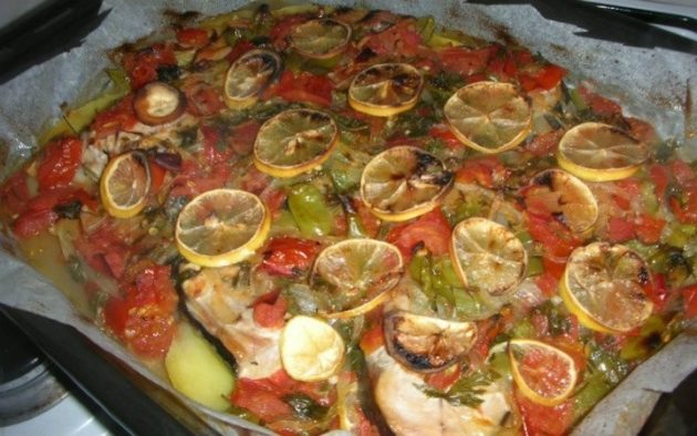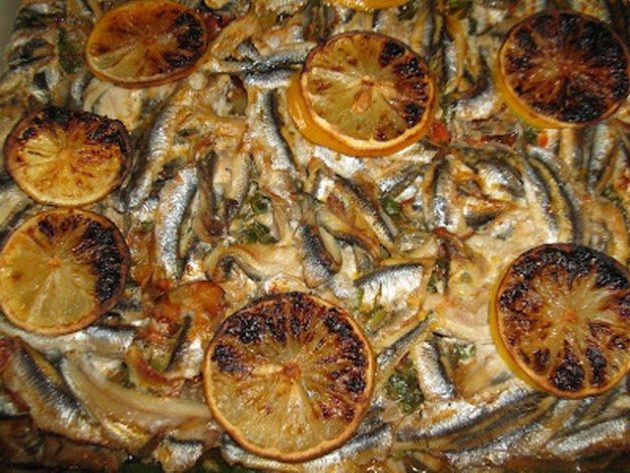 Balıkları temizleyip kılçıklarını çıkarın. 1 tatlı kaşığı tuz ekleyip karıştırıp süzgeçte 15 dakika bekletin. Domates, soğan, patates ve limonu daire şeklinde doğrayın. Tepsiye balıkları tek sıra dizip üzerine sırayla soğan, patates ve domatesi yerleştirin. En üste aralıklı olarak limon ve defneyaprağı koyun. Maydanozu ince ince doğrayın ve limonların üzerine serpin. Tuz, karabiber, zeytinyağı ve suyu karışıma ekleyerek tepsiyi yağlı kâğıt ile kapatın. Önceden ısıtılmış orta sıcaklıktaki fırında pişirin. Fırından alarak sıcak servis yapın.
